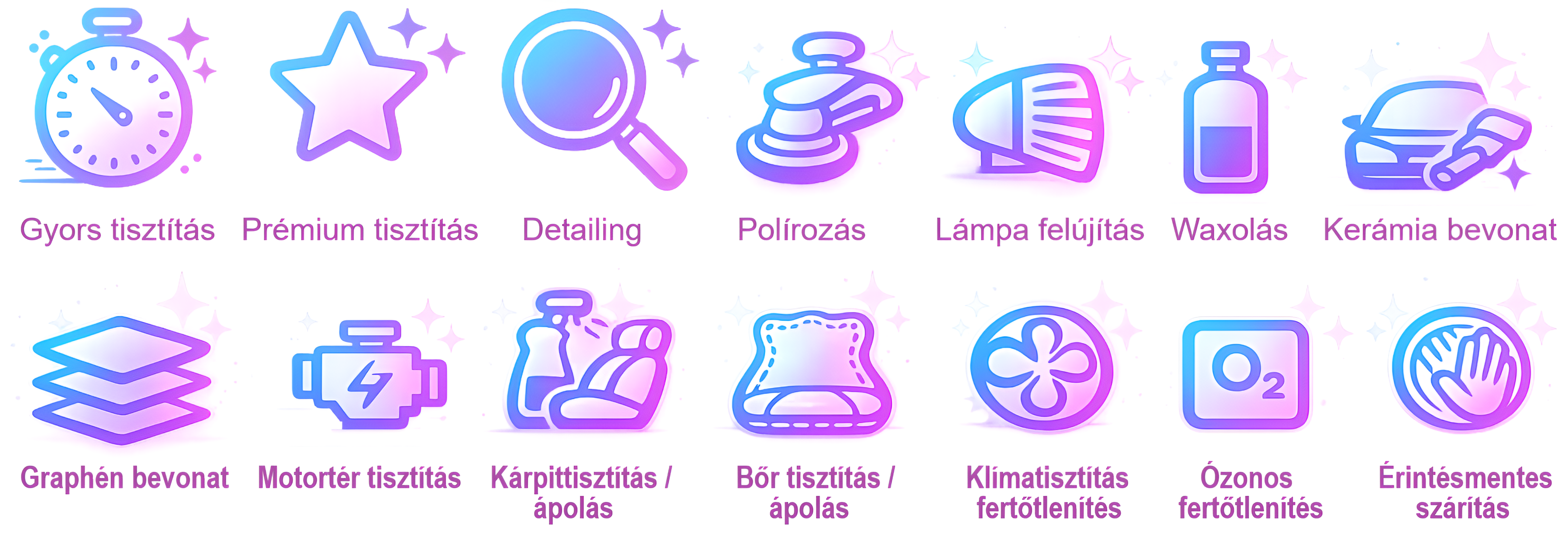 Külső szennyeződések eltávolítása, gyors felni tisztítás, cseppmentes szárítás, porszívózás, belső felületek portalanítása, műanyagtisztítás, ablaktisztítás.